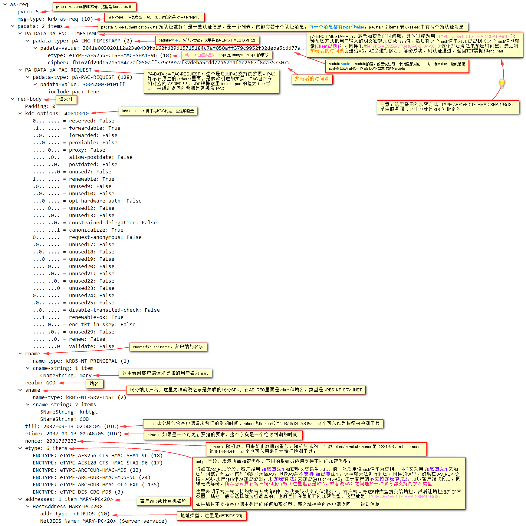 然后 wireshark 过滤器 Vmnet8,再用 mary 用户登陆 mary-PC.god.org ,登陆成功后,我们抓到的 AS_REQ 如下,蓝色部分是解密成功的,解密不成功为黄色